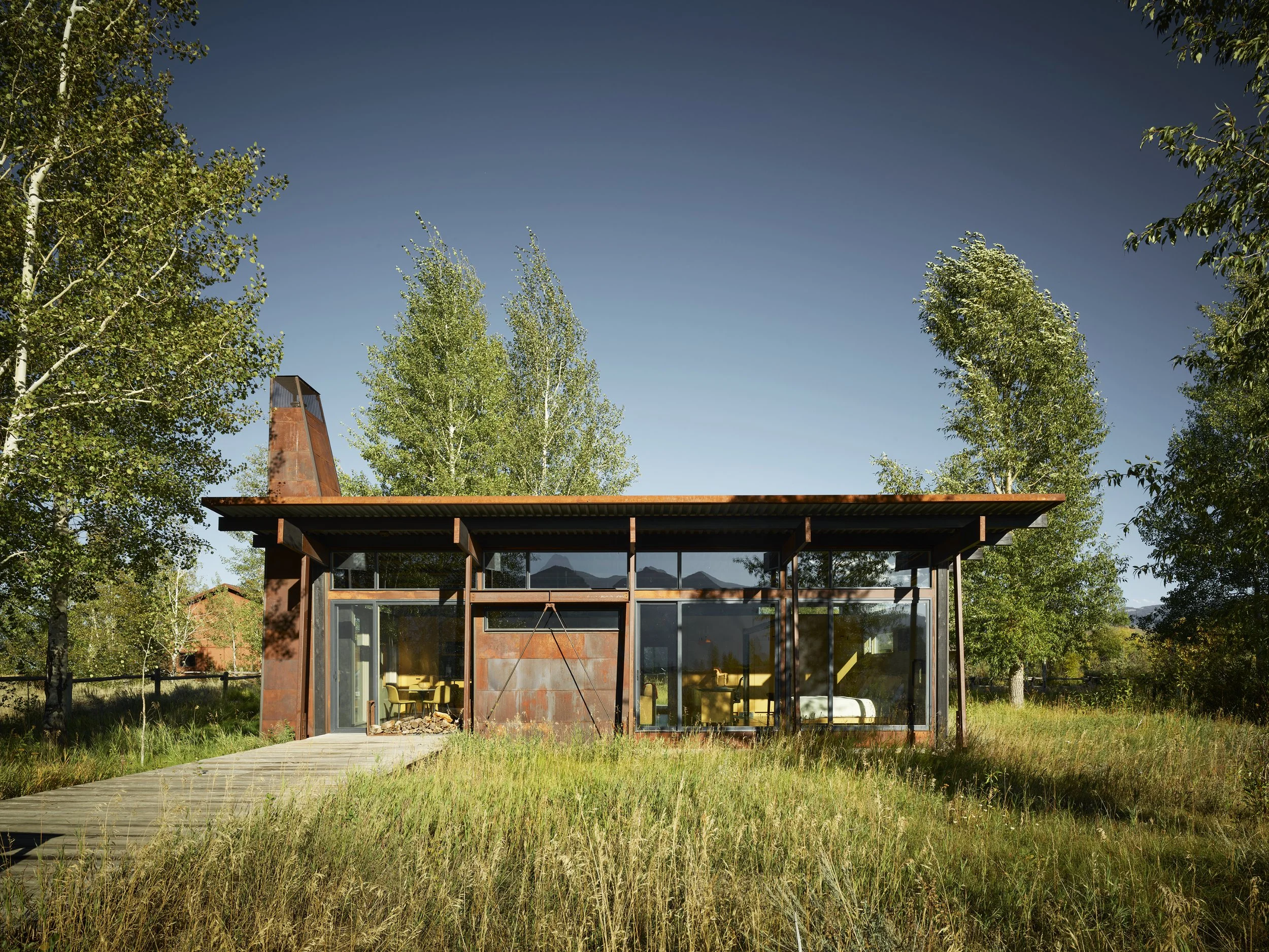 The main residence takes cues from vernacular hay sheds common to the region. A gabled roof, supported by tall columns, provides protection from Wyoming’s extreme climate while remaining visually open to the surrounding landscape. Exterior materials, including rough-sawn cedar siding, oxidized corrugated steel, and ipe decking, were selected for durability and how they age over time. Inside, finishes remain intentionally straightforward: oiled Masonite wall panels, raw MDF cabinetry, and stained concrete floors prioritize function, light, and proportion over surface refinement.
