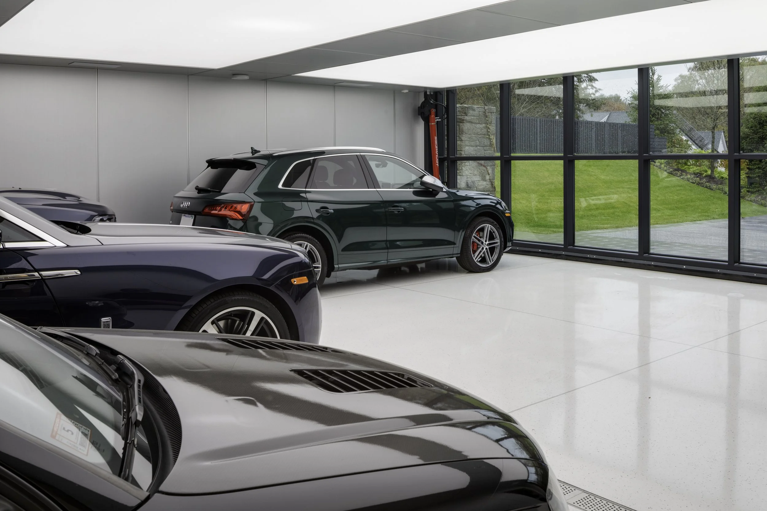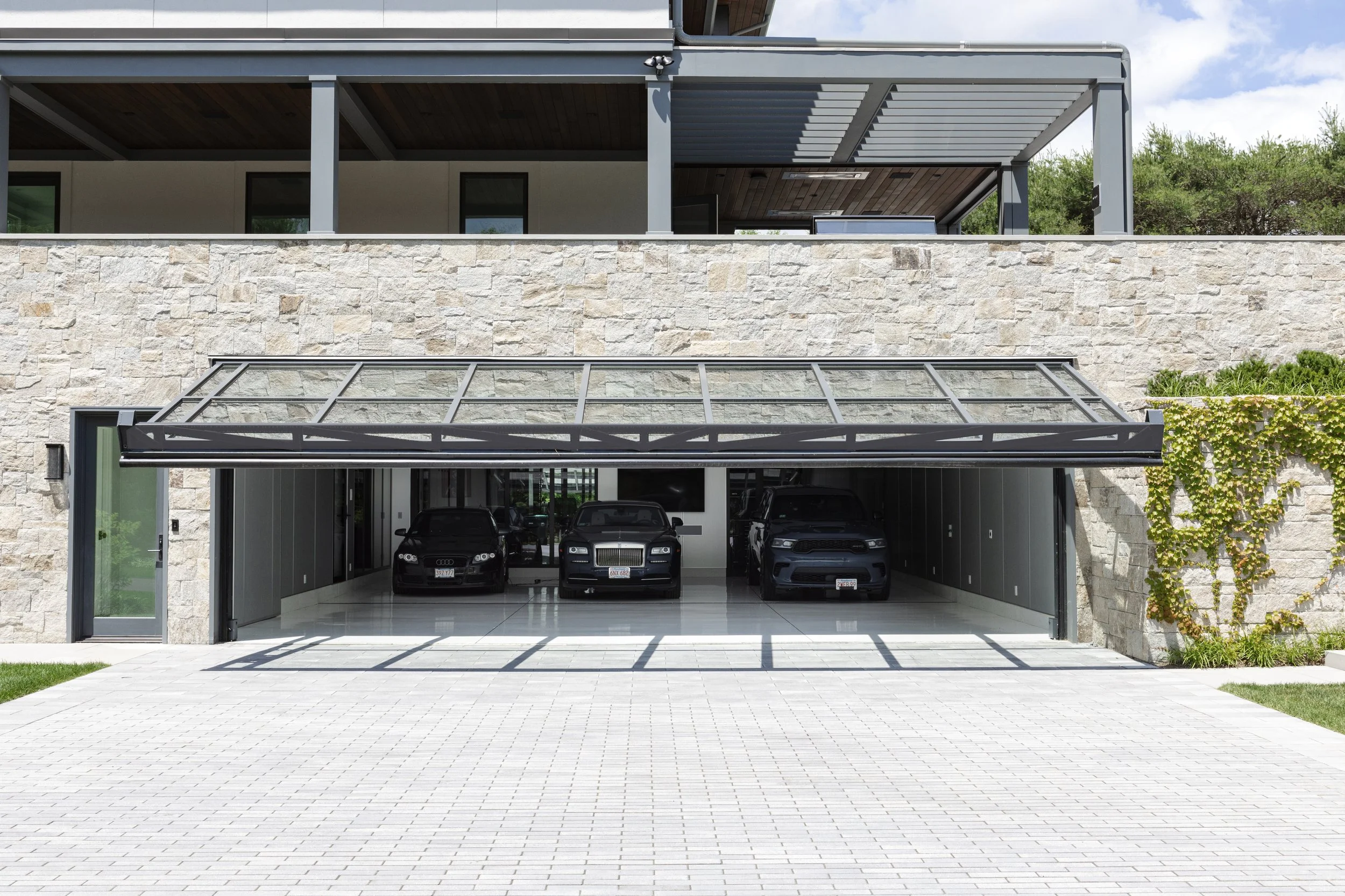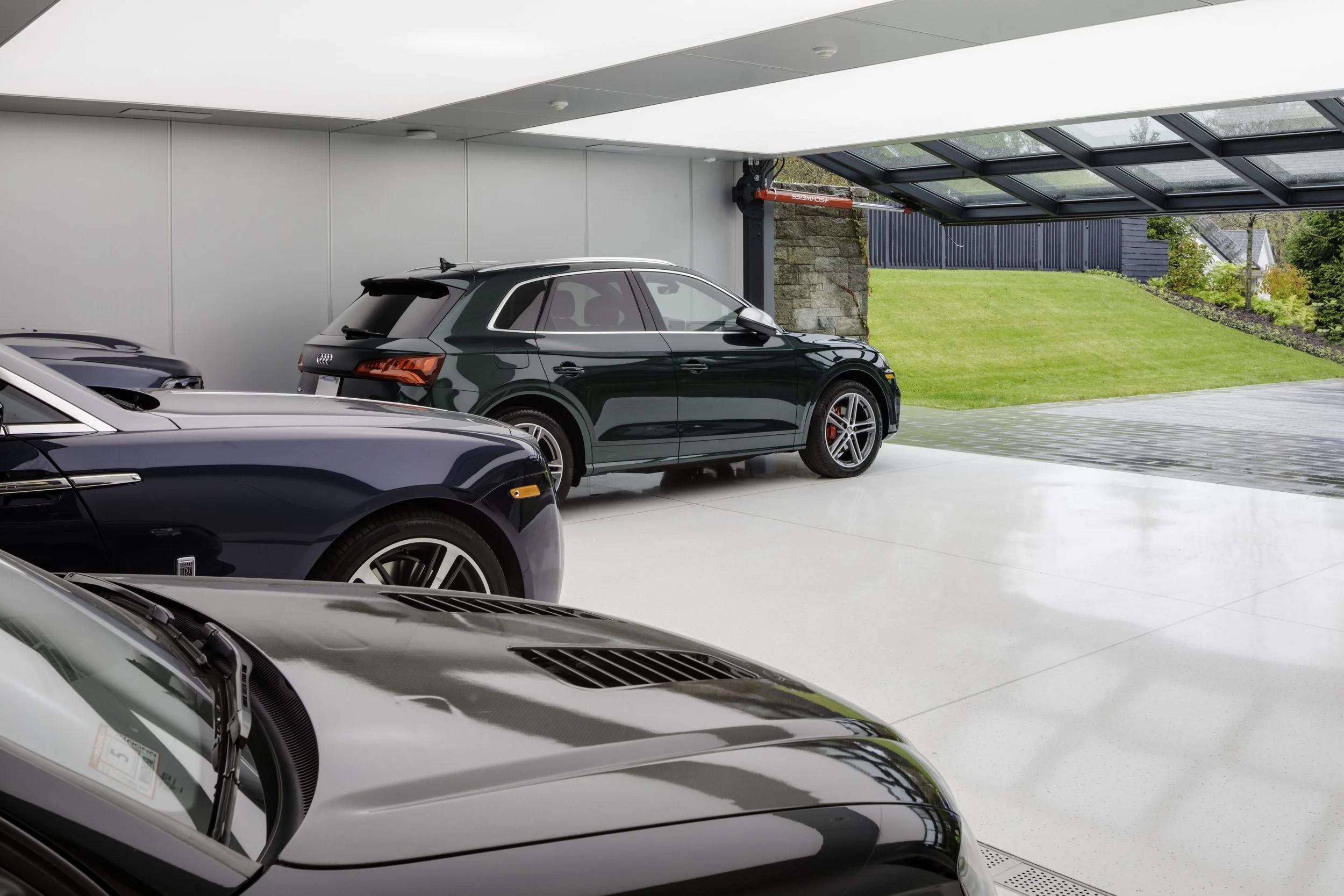 Anchored by a 29-foot glass-and-steel hydraulic door from Schweiss, the garage was conceived not as an afterthought but as the core of the home itself. Radiant-heated terrazzo floors, a luminous Cooledge ceiling, and a full humidity-controlled filtration system create a space where machines are preserved and enjoyed year-round. Every detail was designed deliberately with function in mind, right down to the floor drain with its own oil-water separator.