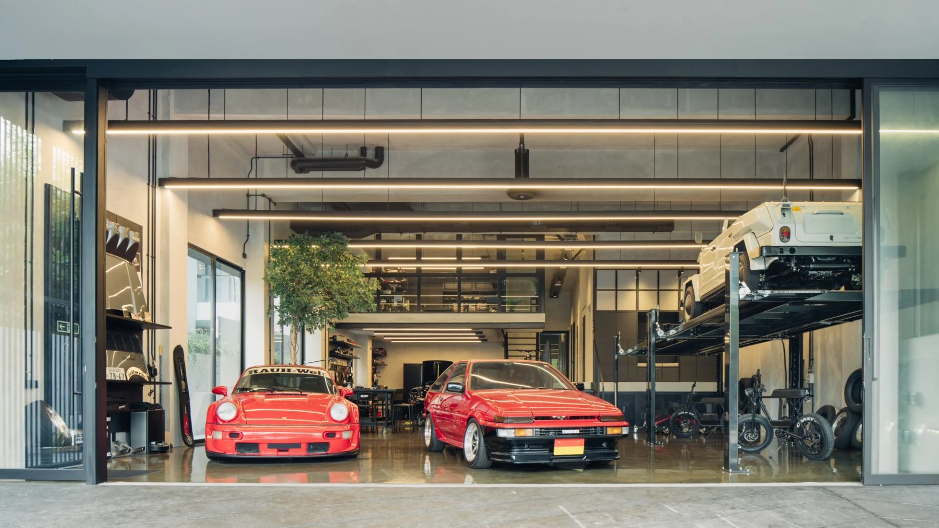The entire first floor serves as his workshop and sanctuary. Among the collection are a Porsche 992 GT3, RWB-built 964, 911 Safari, Toyota AE86, Volkswagen Thing, and Nissan Silvia S15. Every inch was deliberately designed for precision, pleasure, and functionality.