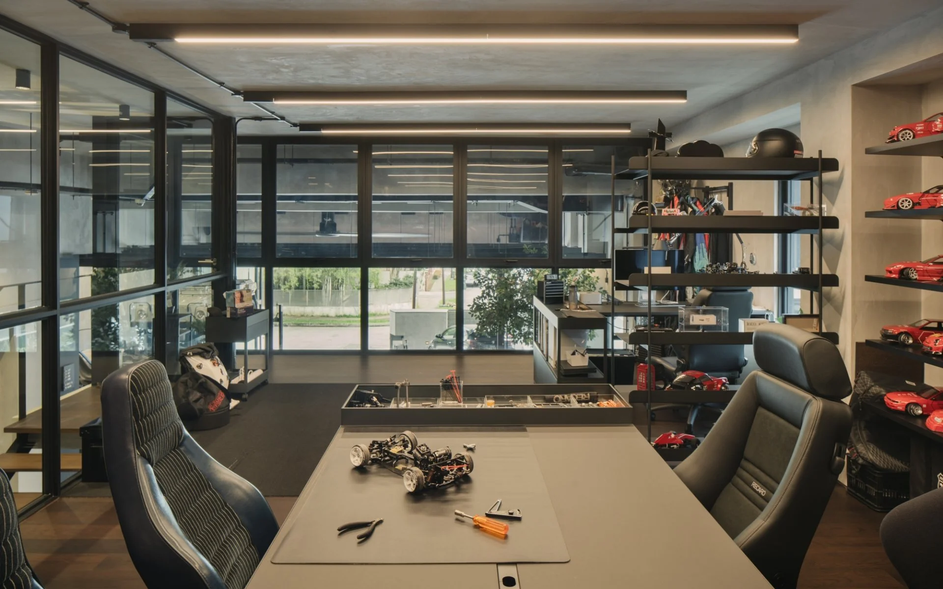 Above the garage sits a floating glass-box office overlooking the cars below, with the living spaces supporting a busy family. The garage, though, is where Tan spends most of his time, often with his children. The space serves as a place where work, restoration, and family merge seamlessly.