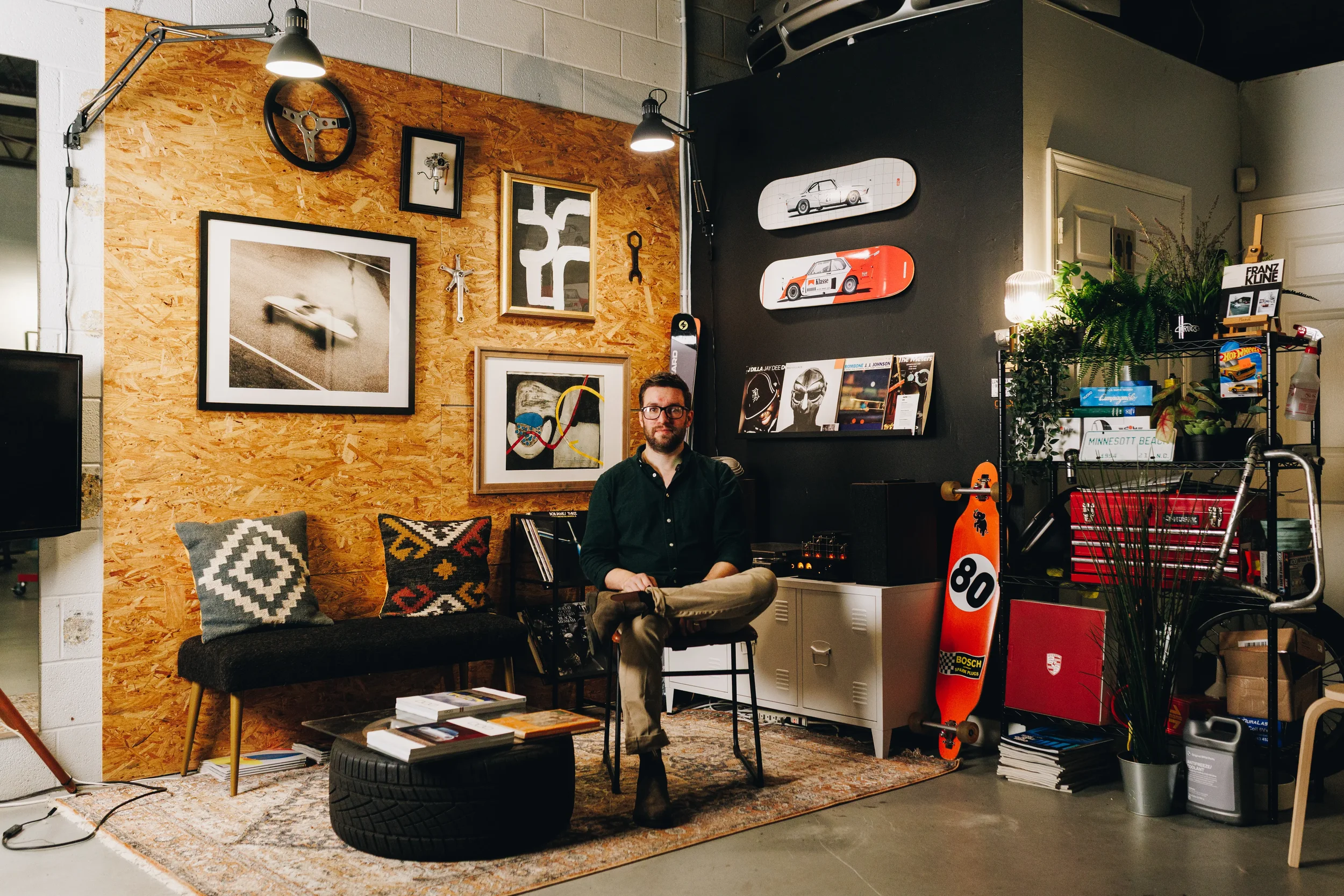 Behind the door of a workshop hidden in plain sight, a sanctuary where vinyl, vintage cars, bikes, and good company define the space.
